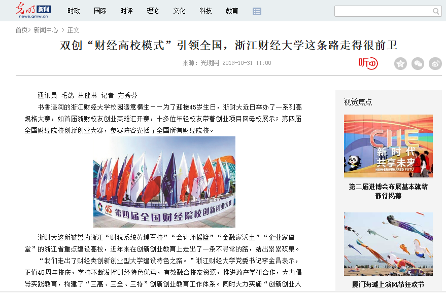 10月30日,《光明网》《杭州日报》、《杭州网》《网易》、《今日头条》、《凤凰新闻》等媒体以《双创“财经高校模式”引领全国,公海gh555000aa线路检测这条路走得很前卫》为题,大篇幅报道了学校不断发挥财经特色优势,有效融合员工资源,推进政产学研合作,大力倡导实践教育,构建“三高、三全、三特”创新创业教育工作体系。